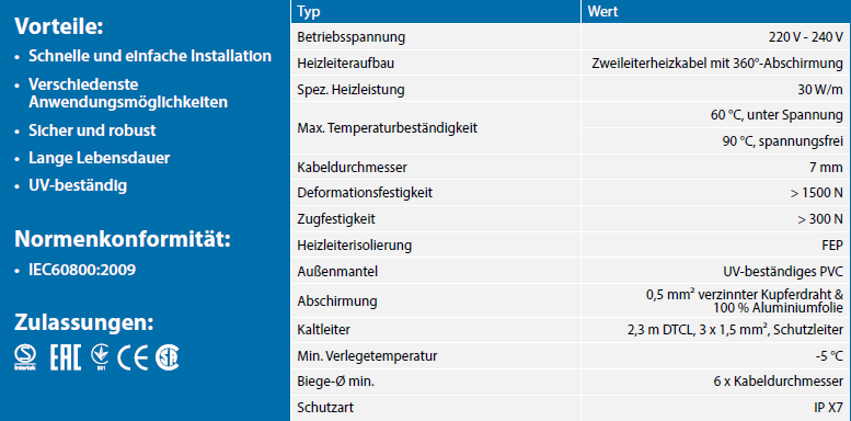 Ihr Rundprofil und die robuste Konstruktionsweise ermöglichen eine schnelle, unkomplizierte und sichere Installation. Typische Anwendungen sind Dach-, Dachrinnen- und Fallrohrheizung sowie Freiflächenheizungen.