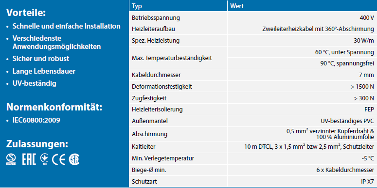 Ihr Rundprofil und die robuste Konstruktionsweise ermöglichen eine schnelle, unkomplizierte und sichere Installation. Typische Anwendungen sind Dach-, Dachrinnen- und Fallrohrheizung sowie Freiflächenheizungen.